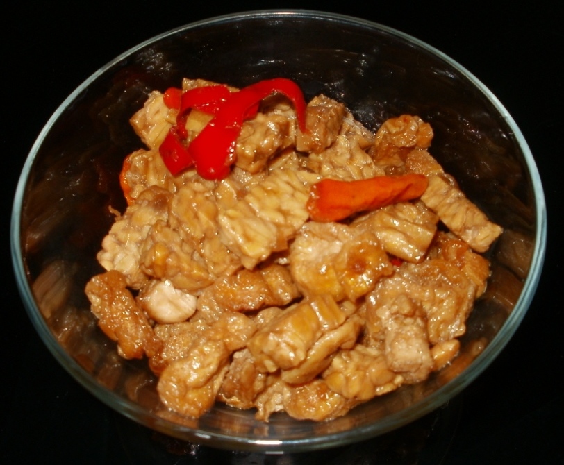 Tahu and tempe are diced